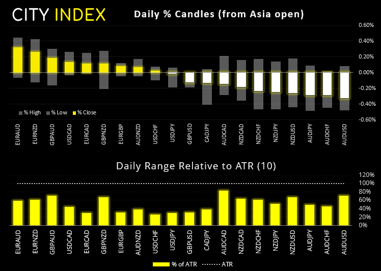 富时100指数价格走势在其200天均线获撑,看起来仍想要上攻,但昨天收回月枢纽下方的看跌外包线有些令人失望。观察期货图表也可以发现,价格在7110/20附近走势特别胶着,此处也是过去28小时和20天内交易最为活跃的价格区域。因此,在富时指数突破7200前,我们更愿意坚持区间交易策略。