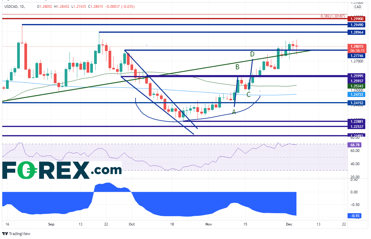 美元/加元过去6个交易日一直徘徊于水平支撑位/前高点1.2775附近。随着油价10月底以来暴跌,美元/加元获得买盘支撑也在情理之中。请注意,美元/加元与油价之间的相关系数为-0.93,达到高度负相关,表明两者背向运动。另外,美元/加元就落在7月以来上斜趋势线(绿色线)上方不远处。阻力位在1.2896附近的前高点(也是小时图上通道的上轨趋势线)和1.2949。但交易者要回到疫情前的水平,重要的是跨越1.2990(红色线)障碍。