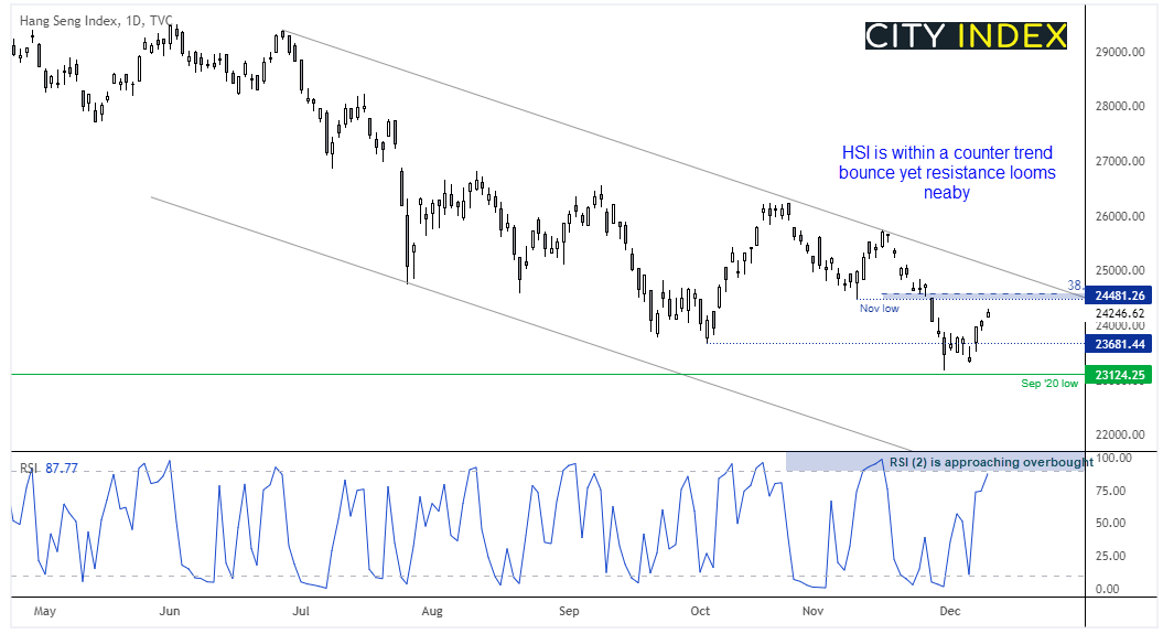 上周我们注意到,亚洲股指可能自关键支撑位反弹,而此后市场风险偏好也助力实现了这一预期。作为反趋势走势的一部分。恒生指数已升至9天高位。但仍处于看跌通道内部,阻力位在24500附近11月低点和38.2%斐波那契回档。我们之后将寻求修正高点成形的证据,价格或重回看跌趋势,但请注意RSI(2)尚未超买,因此或首先会给上行留下部分回旋空间。