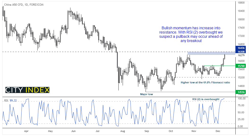 在中国政府决定降低存款准备金率和奥密克戎担忧缓解之后,风险情绪提振,富时中国A50指数处在6个多月以来最为看涨的一周。我们仍认为市场在8月构筑了一个重要低点,股指自10月高点以来的回调于61.8%斐波那契回档附近获撑,形成低点抬高,由于RSI(2)超买,股指突破前或有回调。