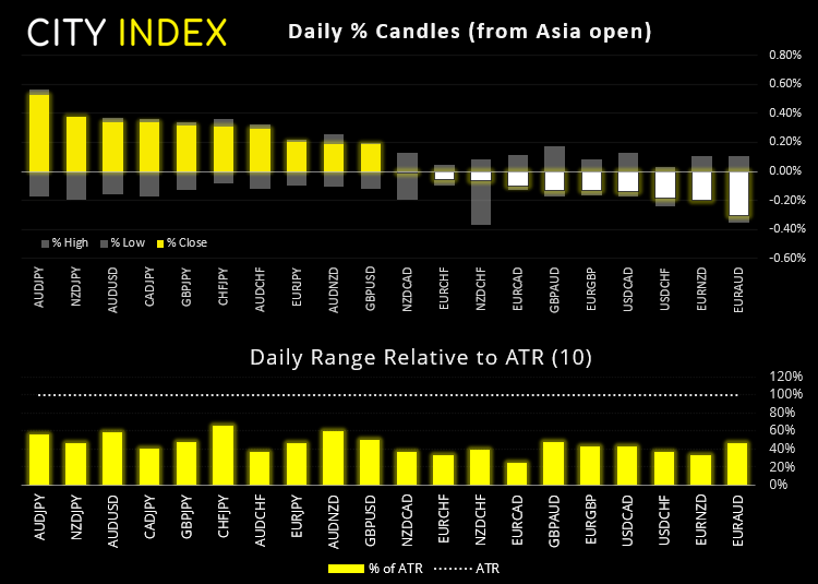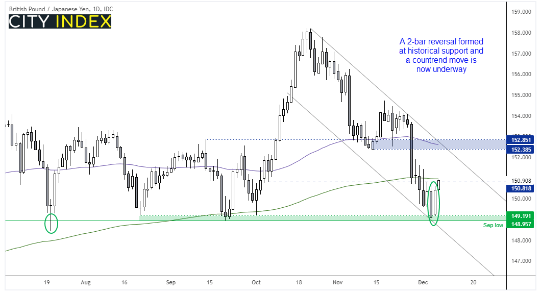 英镑/日元正于一轮反趋势行情中悄然走高。日线图上,货币对处在看跌通道内,不过汇价昨天于9月低点获撑后构筑一条看涨内包线(也请注意149附近7月看涨pinbar)。隔夜交易中,货币对升穿150.82阻力位,并将测试200天均线,若拿下该阻力位,则意味着看涨趋势继续。