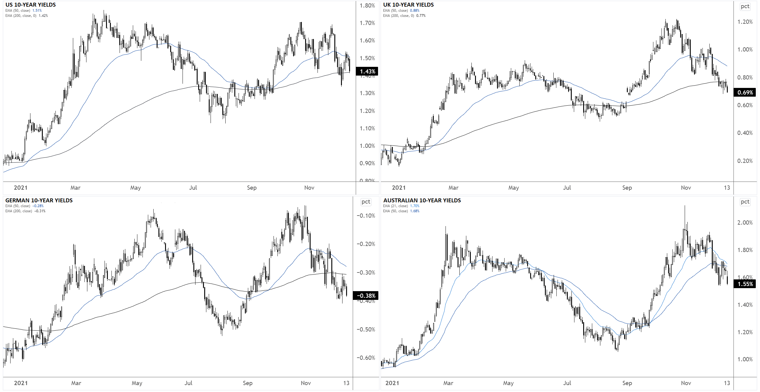 2021年利率普遍走高,上半年走出清晰的上涨趋势,下半年进入区间震荡。下图展示美国、英国、德国和澳大利亚的10年期基准主权债券收益率走势,它们都走出相似的模式:
