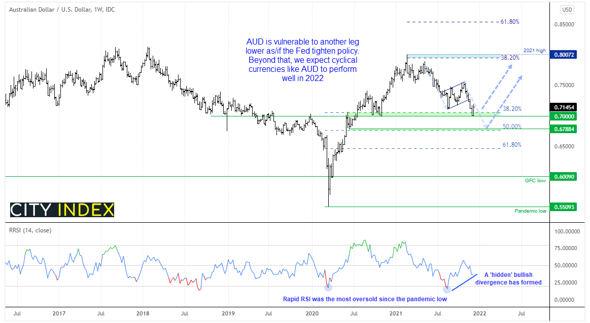 尽管如此,我们仍需考虑美联储的鹰派立场及其紧缩周期,在美元炒作热度消退和焦点转向周期性因素之前,商品货币可能一开始面临看跌,并于其后展开反弹。