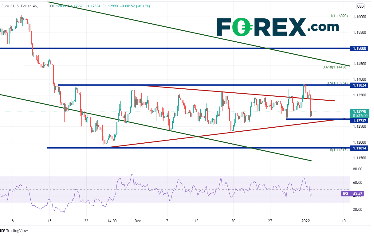 正如我的同事Matt Weller早前所述,美元在新年第一个交易日实现开门红。美元指数假下破2020年3月高点到2021年1月低点的50%回档位附近,后从略高于50天均线所在的95.57,即95.65处暴涨至96.32高点,回到了对称三角形内。随着美元大举上攻,欧元/美元也大举下破且形成看跌吞噬K线,跌幅超过100点子。