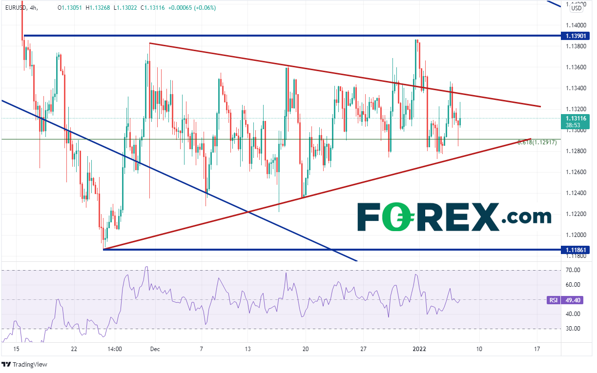 但此文发稿时欧元/美元基本持平,而且4小时图显示其自2021年11月15日以来的近2个月里一直交投于1.1186-1.1390这一大约200点子区间内。而且,欧元/美元已经形成对称三角形,目前逼近形态相汇点(保持低波动状态直到实现重大突破)。