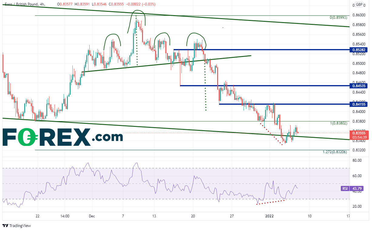 欧元/英镑4小时图同样区间波动,交投区间为0.8330-0.8600,波幅在270点子左右。但和欧元/美元交投于三角形内不同,欧元/英镑从2021年12月8日的区间高点一路走低,形成了头肩顶形态(有两个右肩)后在2021年12月22日强力下破颈线0.8510。头肩顶形态的目标为颈线突破位加上头部到颈线的高度,而欧元/英镑在12月28日到达其目标,即0.8400附近。该货币对此后继续下跌,目前已自长期下降趋势线的下轨趋势线,即0.8350和2021年11月19日低点到12月8日高点行情的127.2%扩展位,即0.8320附近反弹。
