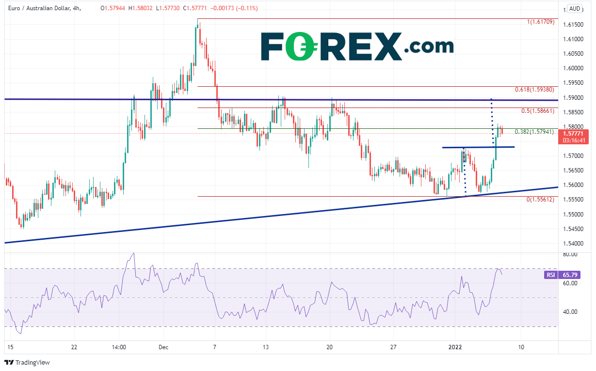 另一个可以关注的欧元货币对是欧元/澳元。该货币对自2021年11月15日以来一直交投于1.5458-1.6171区间内,区间高度超过700点子。欧元/澳元在12月3日最高到达1.6171后开始下跌,于2021年12月31日和2022年1月5日构筑双底,并在1月6日突破双底颈线后开始上攻1.5900附近的目标,但受制于12月3日高点到近期双底行情的38.2%回档位,即1.5794附近。请注意,RSI逼近超买,后市价格可能等待RSI进一步缓解超买状态进入中性,在这期间或许继续盘整。
