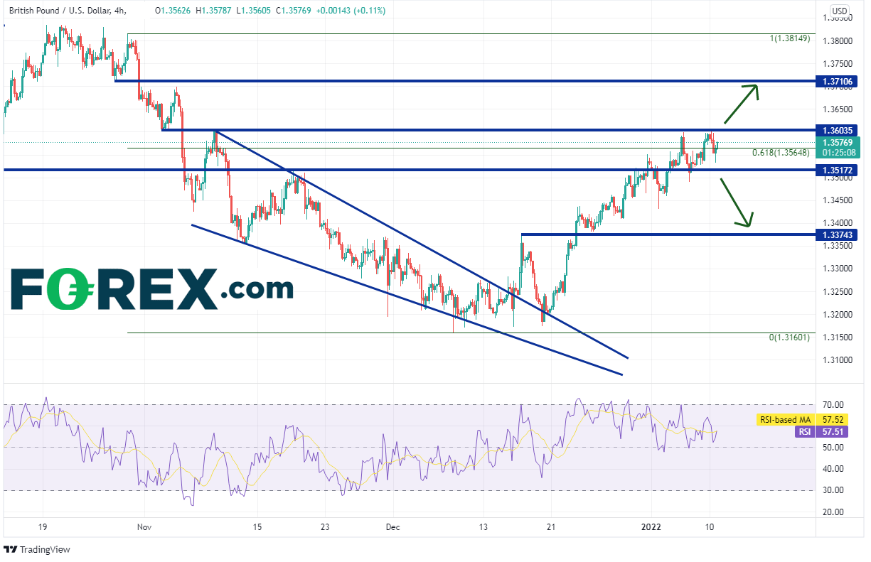 英镑/美元12月15日从1.3250附近向上打破下降楔形,一周后回撤并考验该形态上轨趋势线所在的1.3200附近,守住该支撑位后一飞冲天,一个月内上涨400点子,完全收复楔形失地,最高摸至1.3603。英镑/美元目前徘徊于2021年10月28日高点到2021年12月8日低点行情的61.8%回档位,即1.3565附近。