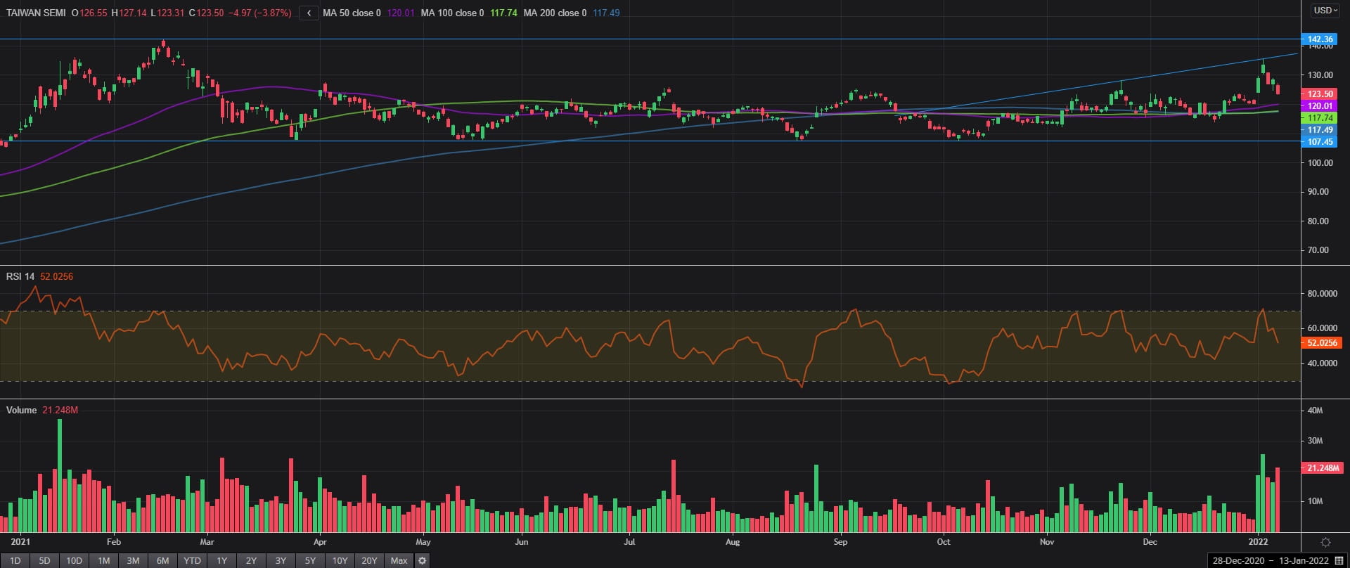 台积电股价在2022年的第一个交易日跳空高开后于1月4日迅速攀升至11个月最高点,后市可能先朝121美元关口回落并填补缺口,与移动均线保持一致。