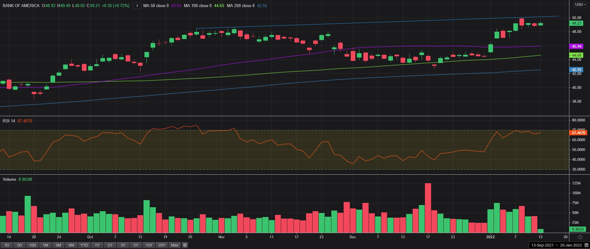 美国银行股价有史以来首次击穿50大关后在1月10日创下历史高点,前几天下跌但无损于2022年以来的上涨趋势。如果四季度业绩及/或展望令人刮目相看,股价有望再度站上50大关并跃升至新高。RSI继续看涨但若探入超买区域,可能和以前一样推动股价短暂下跌。