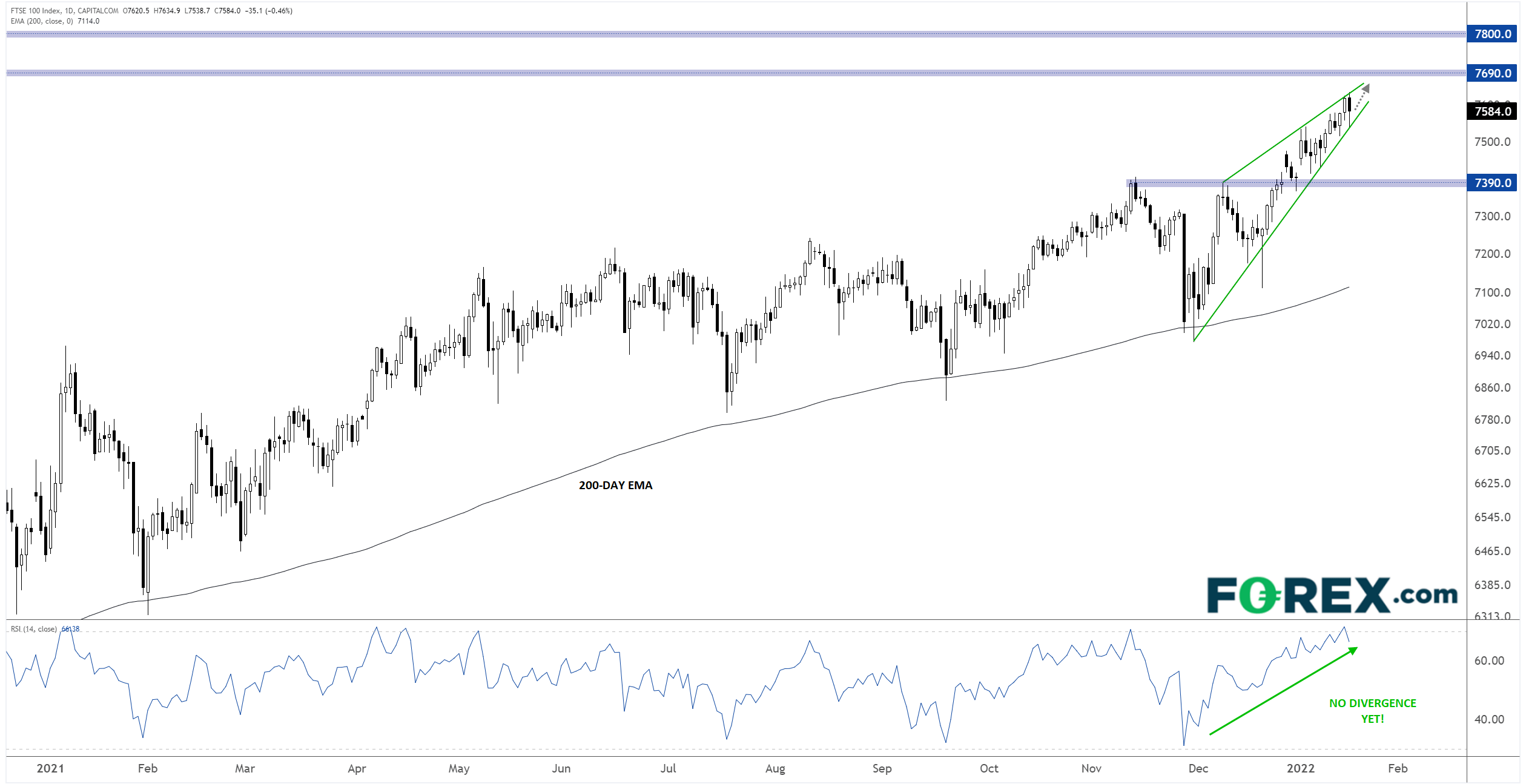 政局不靖并未阻止FTSE 100持续攀升的步伐,其在周一收于2020年2月疫情爆发前的最高水平。不过今天确实因为避险情绪的基调而略有回撤。技术面看,该股指沿着持续了6周的上涨趋势线走高,尚未与14天RSI形成看跌背离,表明当前上涨趋势依然健康,后市很可能延伸:
