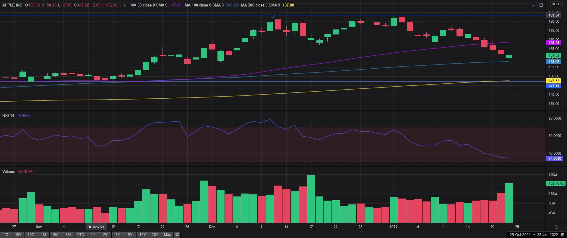 如果一如看跌RSI与成交量放大所示继续下跌,股价可能再度考验100天简单移动均线所在的156,攻克的话可能打开沿着200天简单移动均线下行的空间,目标为在整个10月和11月构成关键支撑的147。