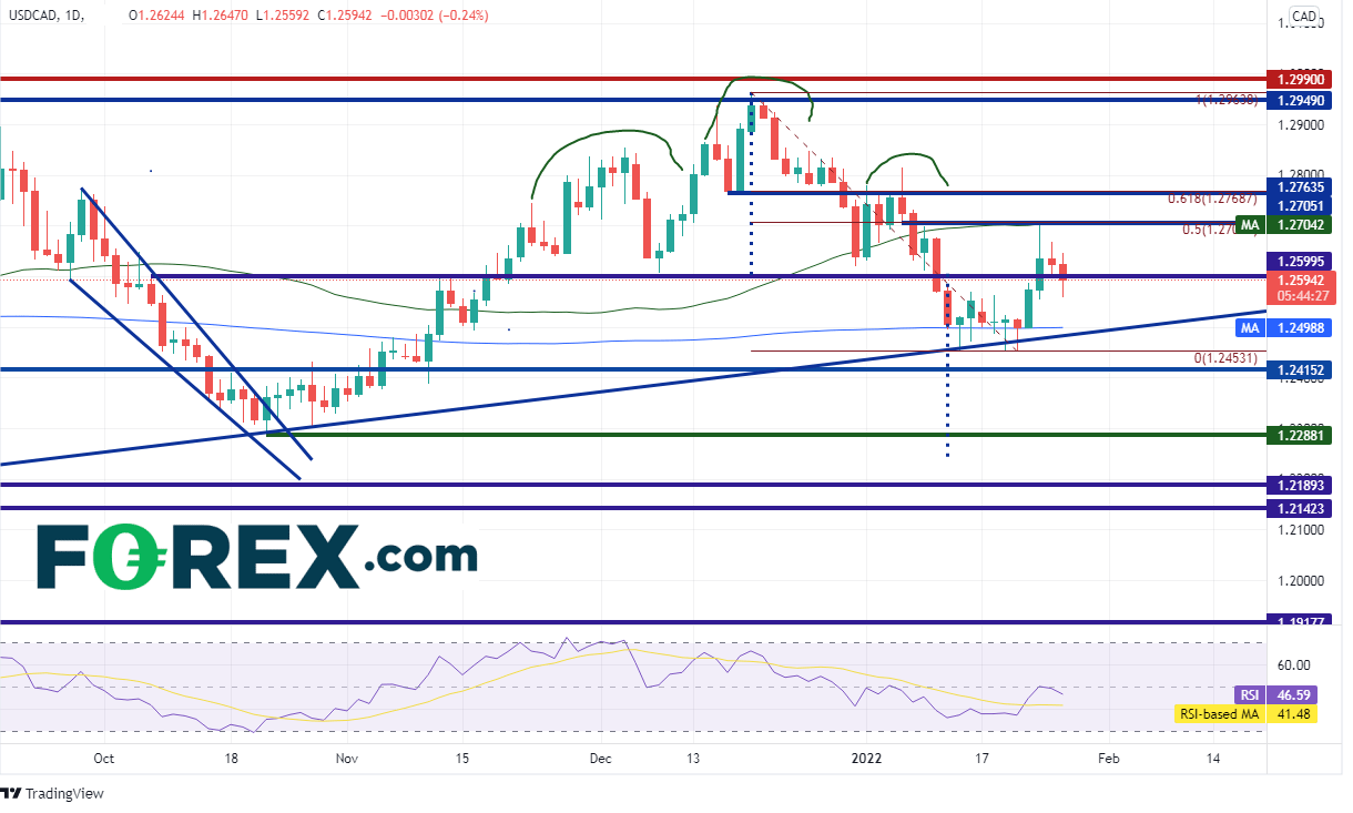 这挑战其长期头肩顶形态。美元/加元突破1.2600附近的颈线后摸至200天均线和2021年6月1日以来的上斜趋势线并保持住。价格在1月24日反弹至50天均线1.2700附近的阻力位并保持住,那也是2021年12月20日高点到2022年1月19日低点行情的50%回档位。美元/加元目前回到头肩顶形态的颈线,如果收上1月24日高点,可能破坏前述形态。该形态如果突破成功,本来的目标在前低点1.2288附近。