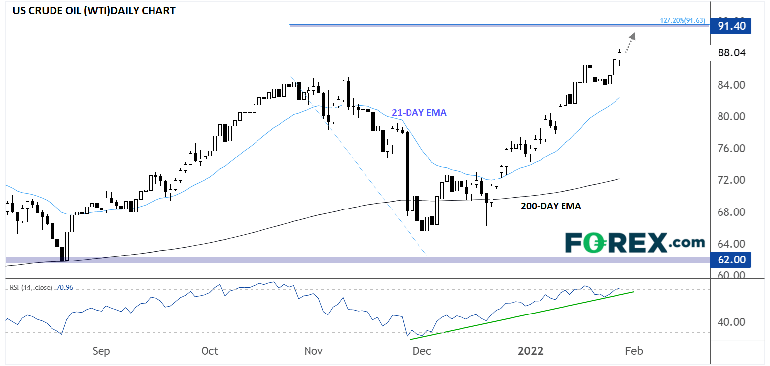 对交易者而言更重要的是,美国原油期货上破88.00附近的上周高点,创下逾七年最高点。从图表看,直至90.00上方,一路没有任何重要阻力位: