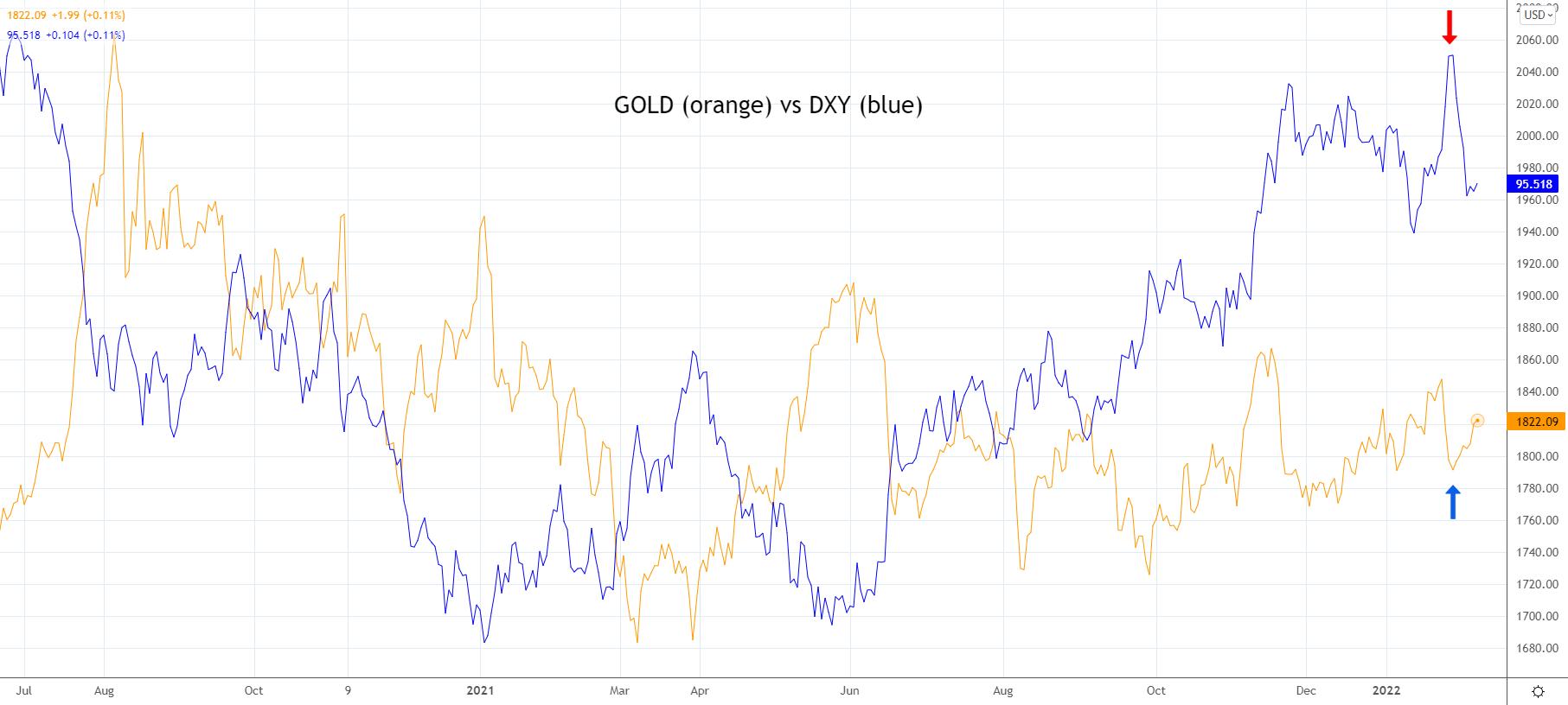 其中部分原因是美元指数回调。在上周的欧洲央行与英国央行会后,美元指数高点回落,为黄金的下档提供支撑。如下图所示,黄金与美元指数走势之间为反向相关。