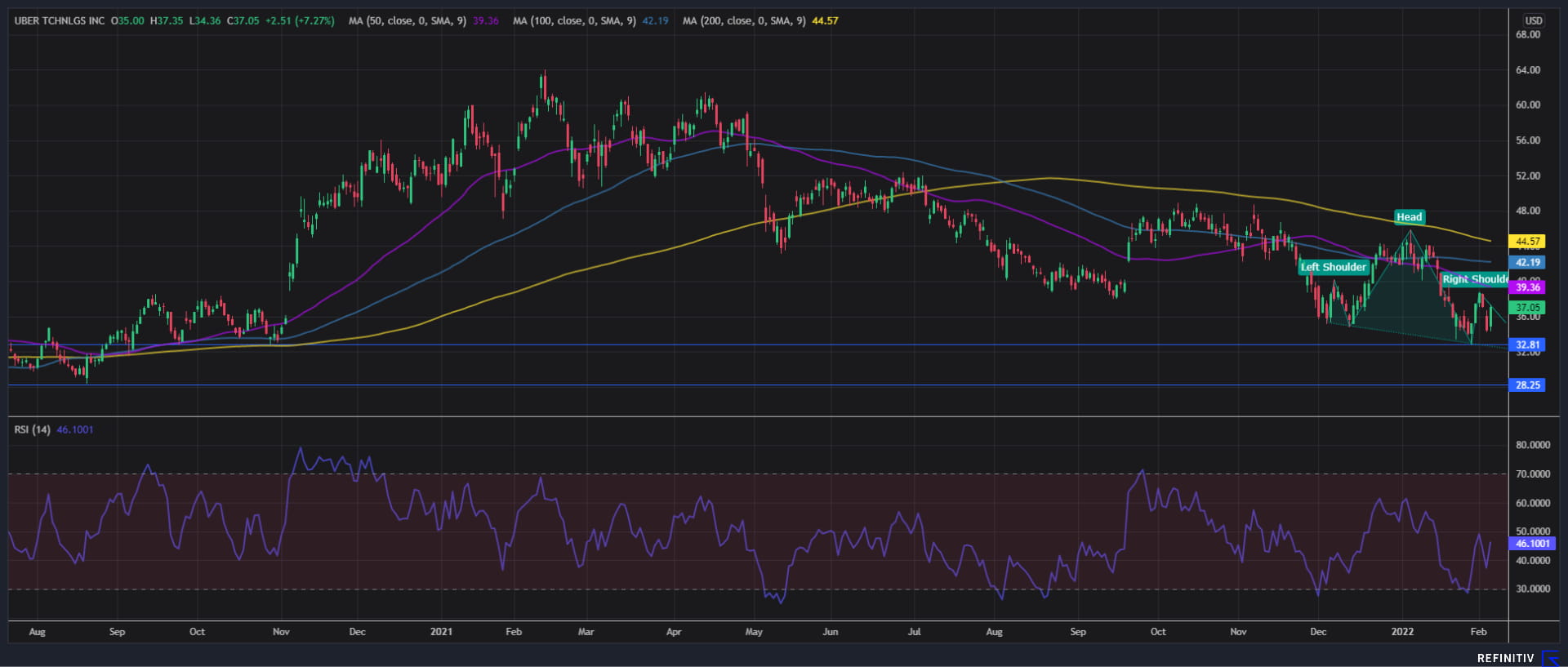 一年前,优步的股价曾达到顶峰,但此后下跌了40%,2022年初继续举步维艰,上周探入17个月低点,一度下穿33美元大关。